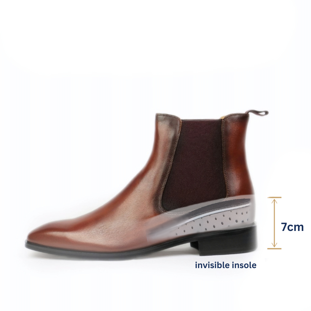 Introducing Aveiro, a luxurious Chelsea boot handmade with the luxurious cognac calfskin leather and brown leather. Featuring an invisible 7cm height increasing insole, ergonomic design, and superior craftsmanship, Volo Alte boots elevates comfort and style to a new level, perfect for the discerning gentleman.